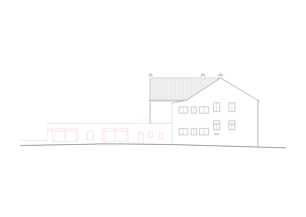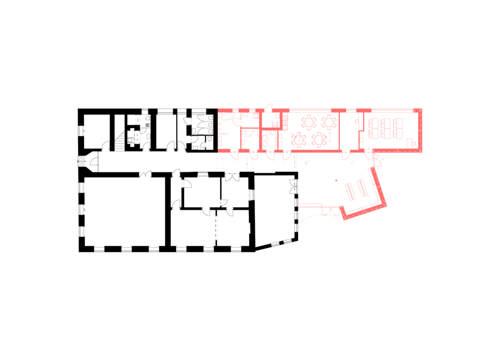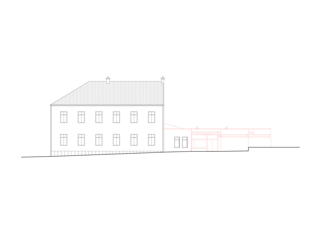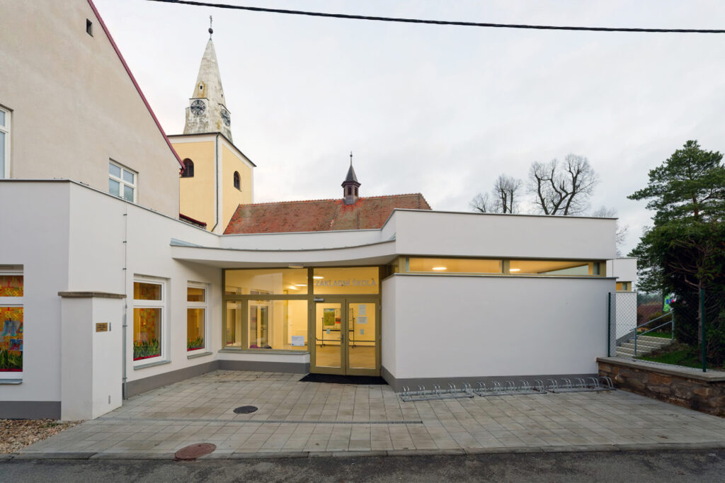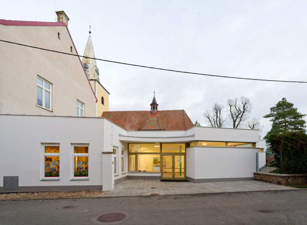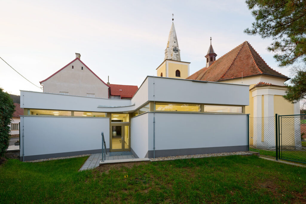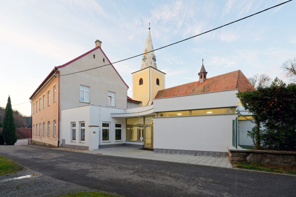 Přízemní přístavba školy s plochou zelenou střechou nahrazuje staré dvorní sklady. Ustoupením od hranice pozemku s komunikací vytváří hlavní nástup do školy, na který navazuje foyer s otevřenými šatnami. Nový střed školy. Součástí přístavby jsou dvě specializované třídy, kabinet, toalety a technická místnost. Nové třídy jsou na hranici pozemku otevřeny ke kostelu. Některé architektonické prvky stavbu propojují s nedávno přestavěnou budovou sokolovny. Celé návrší se pomyslně spojuje.
